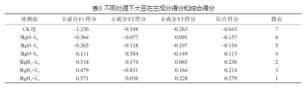 对筛选的主成分进行计算,综合得分见表3。由表3可以看出,MgH2组的综合得分高于MgO组,CK组的综合得分最低。其中,综合得分第1的是MgH2-L3,MgH2-L1和MgH2-L2的综合得分排名分别是2和3。MgO组中,MgO-L3、MgO-L2和Mg-L1的综合得分排名分别为4、5、6。因此,综合得分排名分析表明,MgO包衣可促进大豆萌发和幼苗生长,MgH2包衣比MgO包衣促大豆萌发和生长效果更显著,而MgH2-L3是包衣大豆的最佳配方。