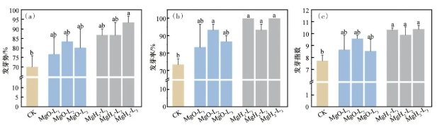图4 MgH2和MgO包衣对大豆发芽势(a)、发芽率(b)和发芽指数(c)的影响