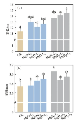 图7 MgH2、MgO包衣对大豆幼苗茎长(a)与茎粗(b)的影响