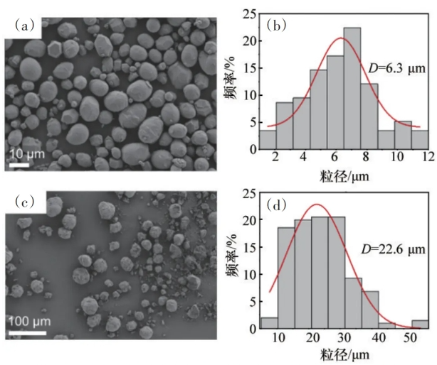 图2 MgH2的SEM图(a)和粒径分析(b),以及MgO的SEM图(c)和粒径分析(d)