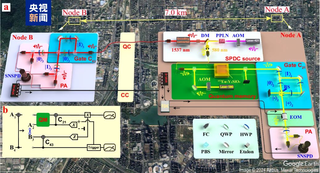 该团队李传锋、周宗权、柳必恒等人基于多模式固态量子存储和量子门隐形传送协议,在合肥市区实现了跨越7公里的非局域量子门。