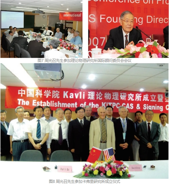 为全面提升中国科学院理论物理研究所的对外开放,2005年,理论物理研究所成立国际顾问委员会,由诺贝尔物理学奖获得者大卫·格罗斯担任国际顾问委员会主席,成员由多位在理论物理相关前沿交叉领域的国际知名科学家组成,包括法国科学院原院长E.Brezin、菲尔兹奖获得者丘成桐等。尽管周老师当时工作繁忙,但他仍然愿意作为国际顾问委员会成员参加每次持续2~3天的会议,为探索理论物理和基础研究的新模式,营造全新的学术生态氛围,与国际顾问委员会成员一起出谋划策(图7)。在国际顾问委员会的帮助和推动下,2006年成立中国科学院卡弗里理论物理研究所(KITPC)。KITPC作为理论物理研究所开放所的拓展和重要组成部分,2007年以全新模式运行,成为学术交流的国际化平台,为全国乃至全世界理论物理学界服务,使理论物理研究所和我国理论物理学界的开放、交流、合作更上一层楼,形成“人才驱动”“项目驱动”“问题驱动”相辅相成的新型模式(图8)。