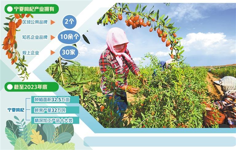 宁夏枸杞产业现有“宁夏枸杞”“中宁枸杞”2个区域公用品牌、10余个知名企业品牌,有国家级龙头企业11家、规上企业30家。截至2023年底,枸杞种植面积32.5万亩,鲜果产量32万吨,精深加工产品十大类120余种,销往58个国家和地区。