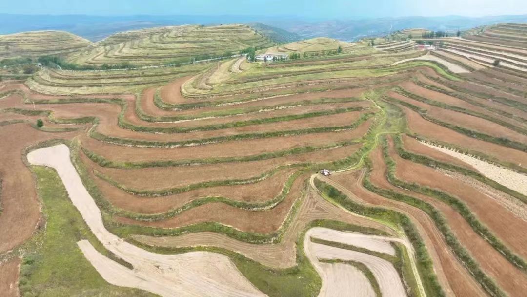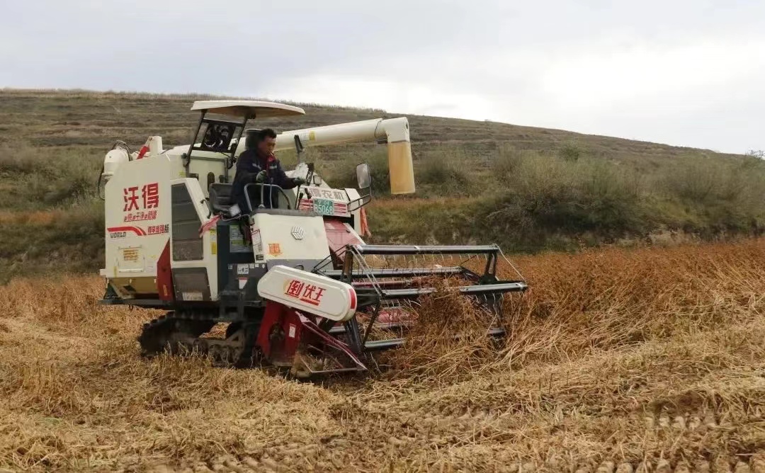 在官厅镇官厅村的层层梯田上,现代化大型收割机正在荞麦地里来回穿梭,经过收割、脱粒和秸秆粉碎等一系列流程作业后,深褐色的荞麦籽粒装满运输车斗。