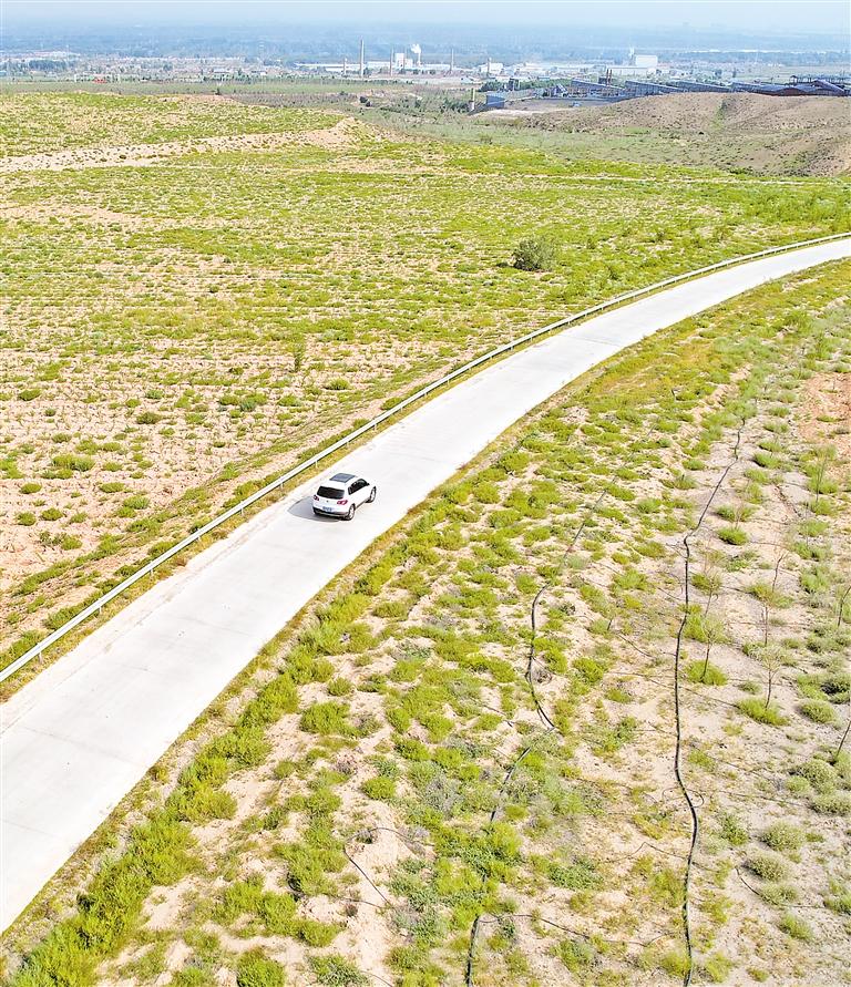 从倪滩村出发向东北方向约半小时车程,来到镇罗镇工业园区附近的北山,乌玛高速从这里横贯而过。这里是涩井沟历史遗留矿山生态保护与修复综合治理项目现场,经过生态修复,葱郁的植被取代了原先的遍地黄沙。