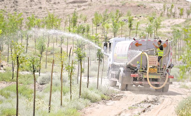 在沙坡头区涩井沟历史遗留矿山生态保护与修复综合治理项目现场,工作人员正在为树木浇水。
