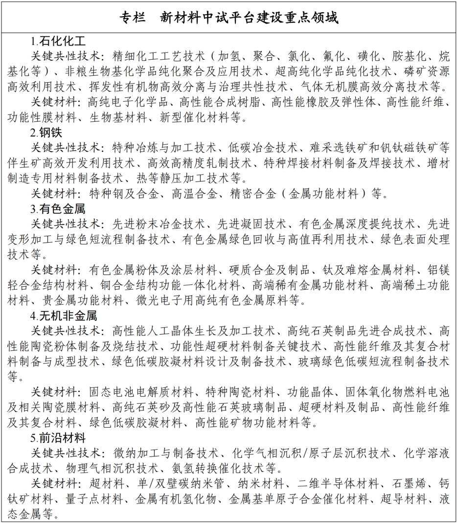 围绕加快推进新型工业化、建设制造强国战略需求,着眼事关国家安全和经济建设的关键短板材料、引领新兴产业和未来产业发展的前沿材料,聚焦“触类旁通”效应明显、行业进步带动性强的关键共性技术,确定新材料中试平台建设的重点领域。