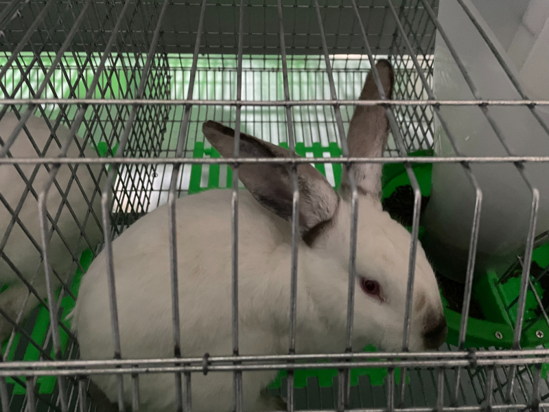 10月10日,记者走入位于星海镇星海村的宁夏振星农业科技有限公司养殖大棚,一排排整齐排列的兔笼映入眼帘。一只只憨态可掬、浑身洁白的母兔子被放在并联式“单间”里,或悠闲吃食或小心舔舐皮毛,甚是可爱。耳朵和鼻尖呈黑色,其他部位为白色的公兔“八点黑”被圈养在另外一排兔笼内。