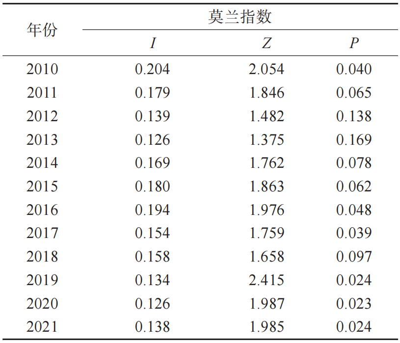 本研究使用空间计量模型测算2010-2021年31个省份(直辖市、自治区)粮食生产韧性的莫兰指数(表8),均为正值,且大部分年份在10%的置信水平下显著,表示样本之间存在空间正相关性。