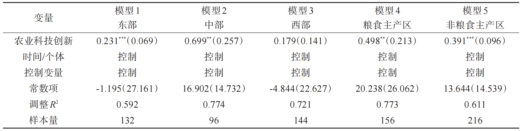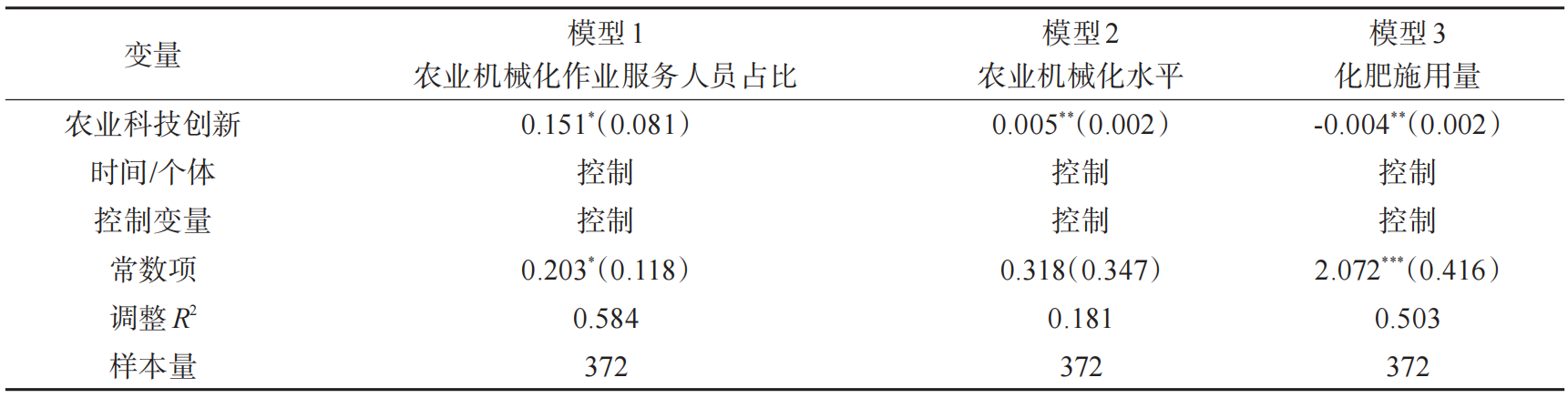 2)粮食主产区差异。粮食主产区和非粮食主产区农业科技创新估计系数均为正,表明农业科技创新对粮食主产区和非粮食主产区均有正向影响。3.4 机制分析