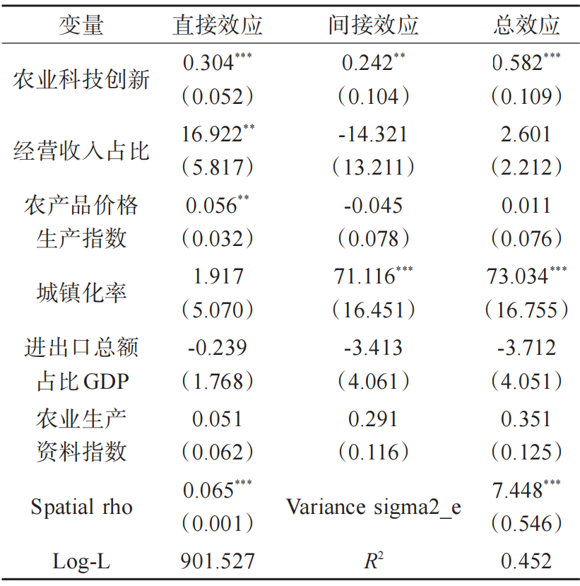 3)运用空间杜宾模型估计农业科技创新对粮食生产韧性的溢出效应发现,农业科技创新的空间溢出效应显著为正,表明本地区农业科技创新会正向影响邻近地区粮食生产韧性。
