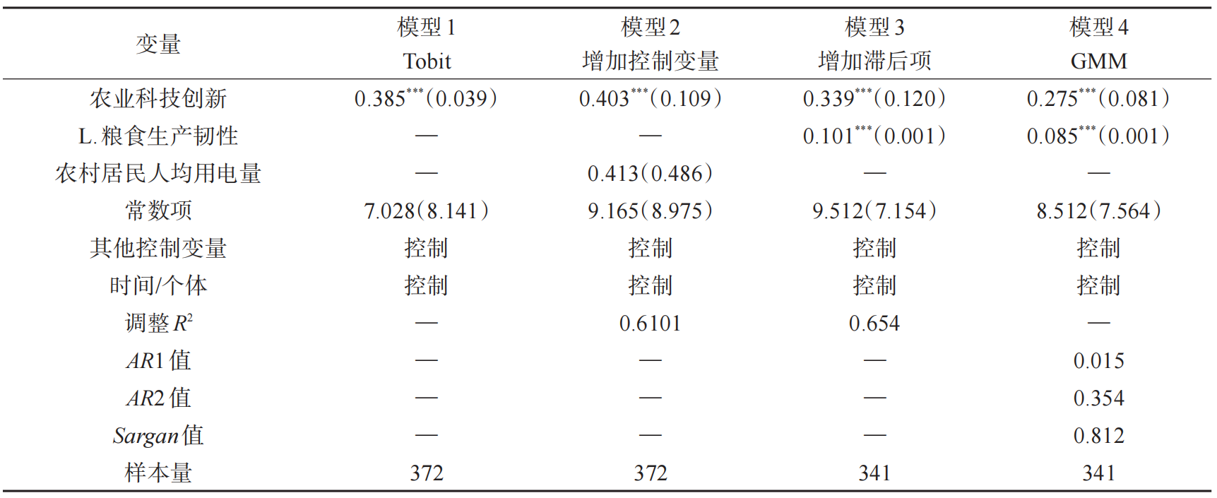 本文采用以下4种方式进行稳健性检验:替换计量模型、增加控制变量、增加因变量滞后项以及差分广义矩估计法。在模型中增加粮食生产韧性的滞后项并采用差分GMM模型来解决模型因内性导致的估计偏误。模型3为增加滞后一期粮食生产韧性(L.粮食生产韧性)作为自变量的估计结果,农业科技创新的估计系数依然显著为正。模型4为差分GMM模型估计结果,说明扰动项不存在自相关,不存在过度识别的问题满足差分 GMM 使用条件。差分GMM模型实证结果中农业科技创新的估计系数在1%水平下显著为正,表明前文结论具有一定稳健性和可靠性。