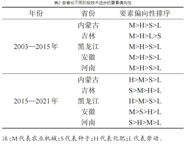在第一阶段(2003—2015年),各省要素配置偏向较为一致,即以农业机械为代表的劳动节约型技术对劳动的替代效果远超以化肥和种子为代表的土地节约型技术对劳动的替代效果。在第二阶段(2015—2021年),各地区要素配置偏向存在异质性,受技术和农艺等因素制约,农业机械对劳动的替代效果逐渐减弱,除安徽省外,各省以种子和化肥为代表的土地节约型技术对劳动的替代效果逐渐超过以农业机械为代表的劳动节约型技术对劳动的替代效果。