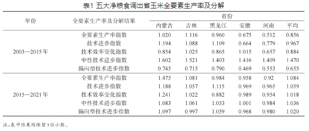 通过对粮食增产现状的分析发现,当前粮食生产所需的资源要素结构和相对价格已发生变化,因此探寻粮食产能提升路径,要对粮食生产技术进步偏向进行分析。本文选取五大粮食净调出省份作为研究对象,采用非参数数据包络分析(DEA)方法测算全要素生产率指数(TFP-Malmquist),并按照Färe等的分解方法,通过分解TFP-Malmquist得到技术进步偏向指数。在测算过程中,将产出指标选为单产产量,投入指标选为用工量、化肥用量、种子用量和机械作业费。此外,鉴于2015年后粮食产量和粮食作物种植结构基本稳定,本文将样本研究期间分为2003—2015年和2015—2021年2个阶段进行考察,测算结果如表1所示。