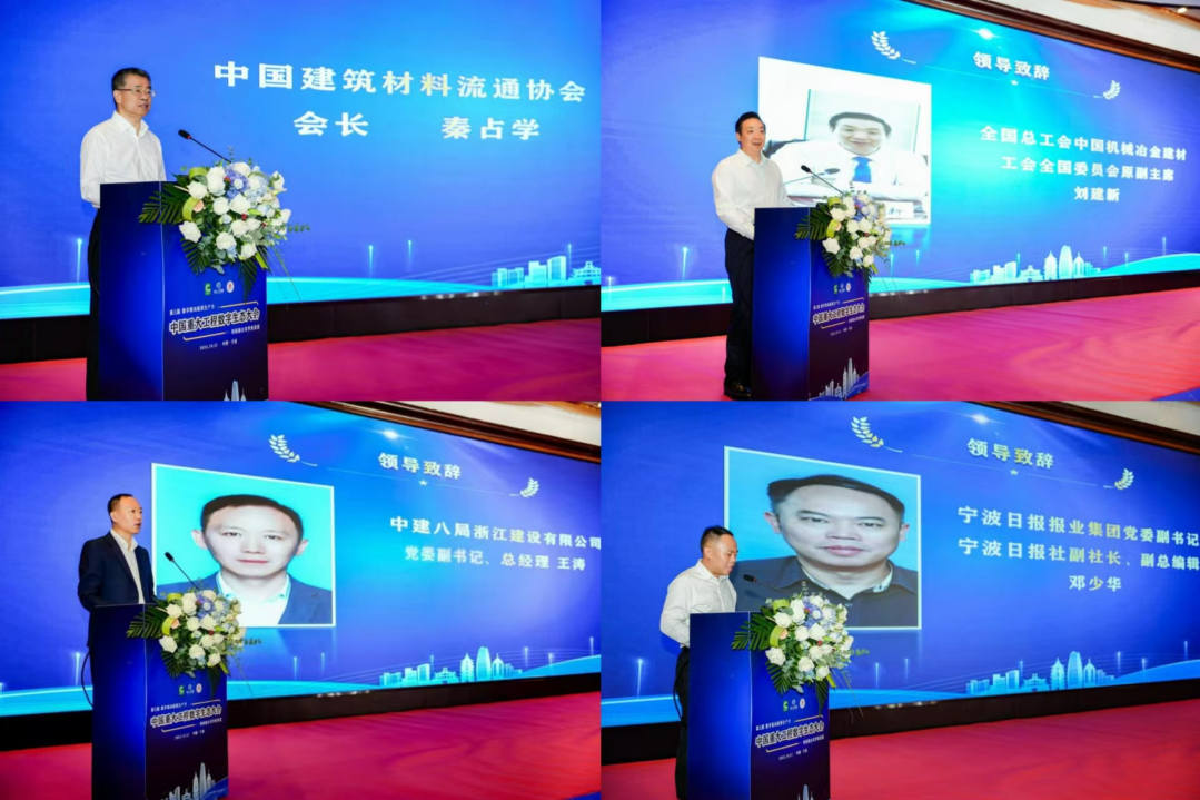 中国建筑材料流通协会会长、商务部消费观察员、武汉理工大学兼职教授秦占学,中建八局浙江建设有限公司党委副书记、总经理王涛,全国总工会中国机械冶金建材工会全国委员会原副主席刘建新,宁波日报报业集团党委副书记、宁波日报社副社长、副总编辑邓少华依次为大会致欢迎词。