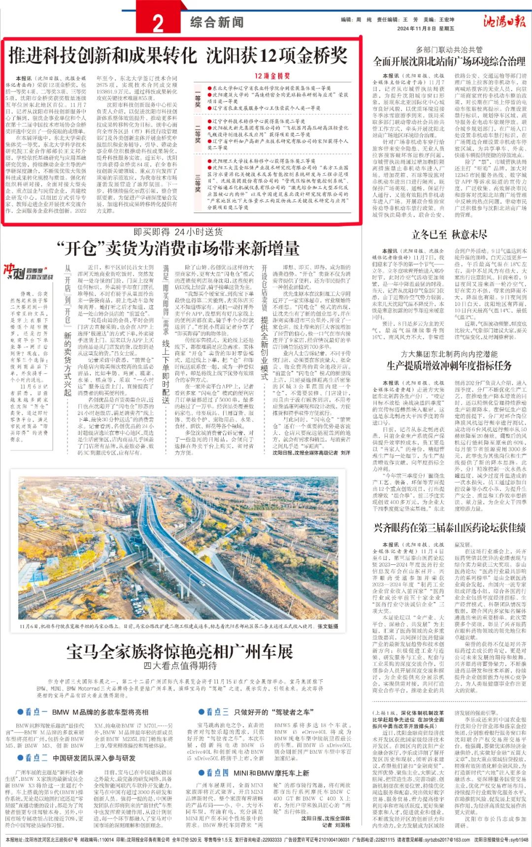 沈阳日报:推进科技创新和成果转化 沈阳获12项金桥奖