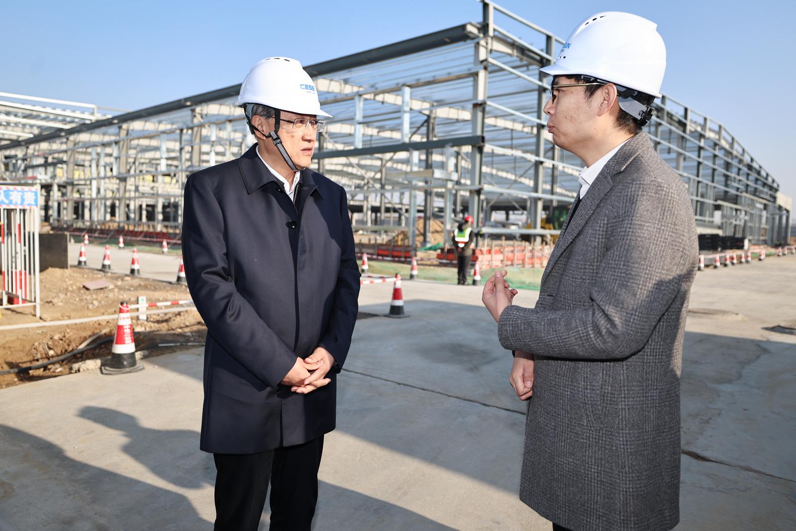 李邑飞在华晟新能源20GW异质结专用单晶硅材料智慧工厂项目现场,调研工程建设情况。
