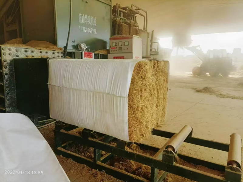 稻草被加工成50公斤的小包和400公斤的大包,整齐码放在彩钢大棚内,以满足客户的不同需求。