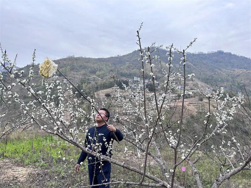 贵州省农科院果树研究所副研究员彭志军在镇宁县六马镇板阳村蜂糖李试验示范基地开展人工授粉工作。