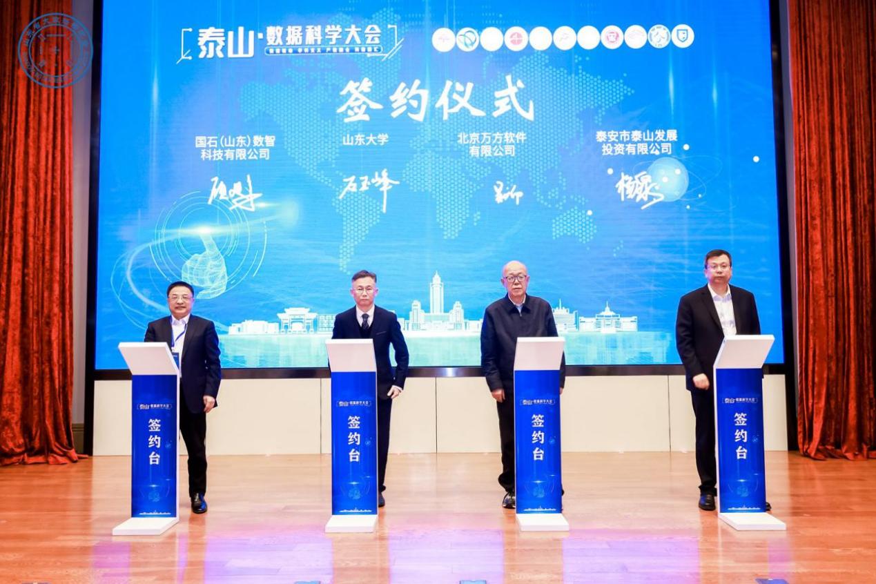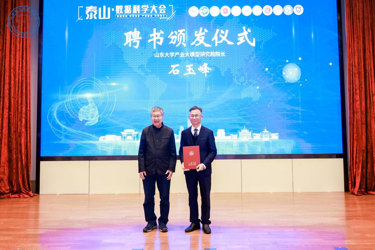 山东大学、北京万方软件有限公司、国石(山东)数智科技有限公司、泰安市泰山发展投资有限公司四方签署了山东大学产业大模型研究院共建协议,中国科学院院士、研究院理事长彭实戈为石玉峰等颁发了聘书。