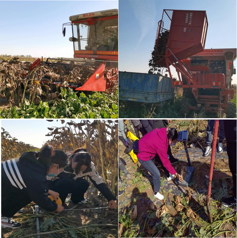 测产现场,技术人员严格按照《高油酸油葵及配套高效栽培技术示范实施方案》要求,重点对高油酸油葵套种甜菜栽培项目区进行实收测产,现场量取油葵株行距、机械实收、装袋、称重、除杂;伴随收割机的轰鸣声,成熟的油葵花盘被精准而高效地收割,通过传送带送入机器内部进行处理,再通过翻转储藏箱输送到一旁的车斗内。此外,技术人员还对项目区套种的甜菜进行人工收割并测产,大家有条不紊,分工明确,量取株行距、砍秧、称重、计数,整个现场高效有序进行。