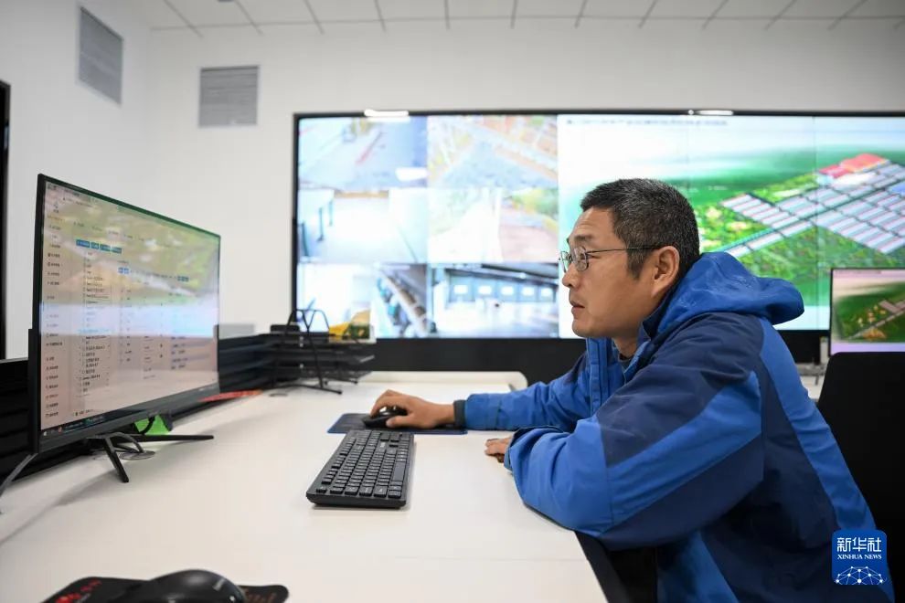 10月29日,在内蒙古巴彦淖尔市临河区富川现代肉羊产业科技示范园区智慧指挥中心,工作人员远程控制投料机器人。新华社记者 贝赫 摄