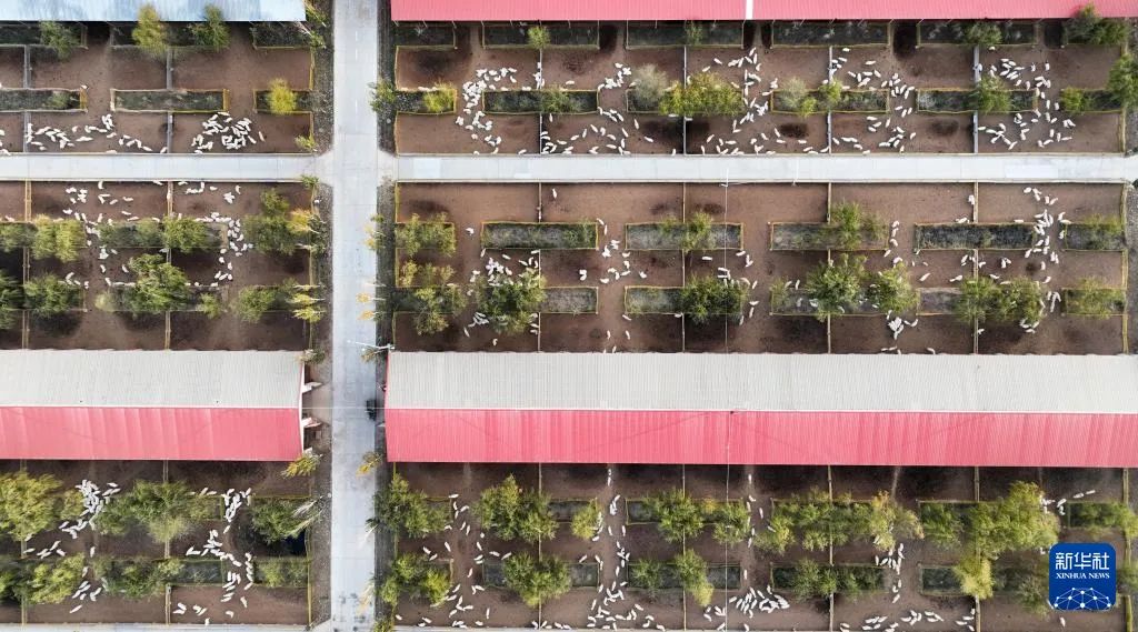 10月29日拍摄的内蒙古巴彦淖尔市临河区富川现代肉羊产业科技示范园区羊舍(无人机照片)。新华社记者 贝赫 摄
