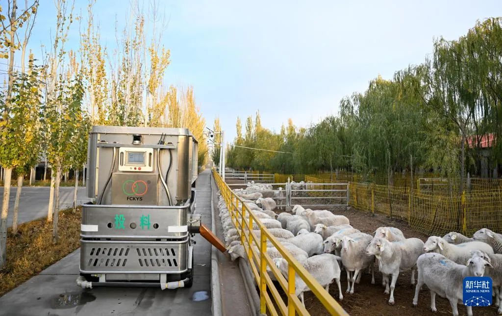 10月29日,在内蒙古巴彦淖尔市临河区富川现代肉羊产业科技示范园区内,投料机器人在工作中。新华社记者 贝赫 摄