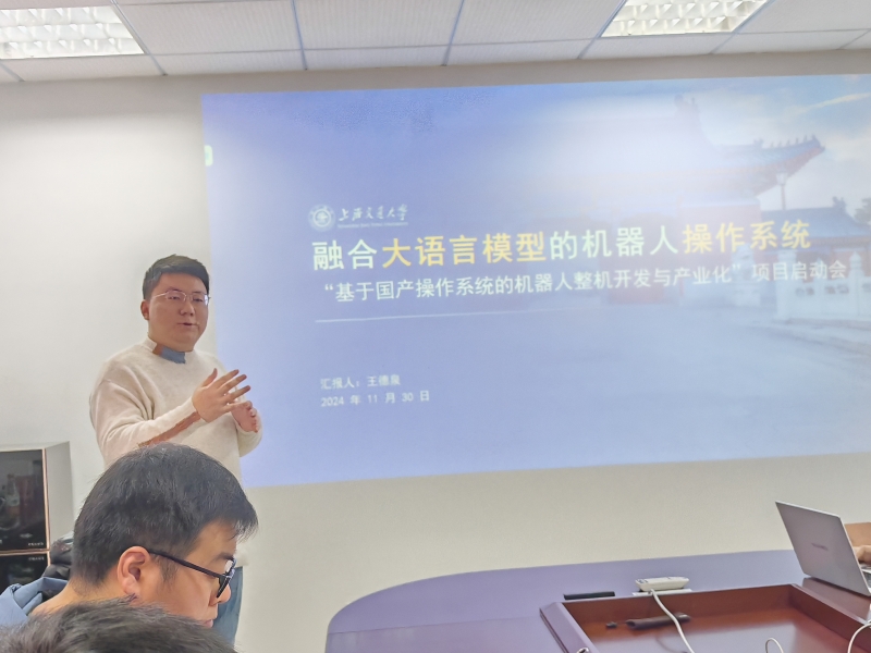 会上,济南市历下区科技局分管领导首先感谢各位专家莅临指导,对项目获得省级财政科技股权投资表示祝贺,希望各承担单位通力合作,开发出国产的机器人操作系统,助力国产替代加速突围。项目负责人浪潮智能终端有限公司研发中心副总经理程瑶就项目整体实施、组织架构、资金保障等方面进行了整体介绍;上海交通大学博士生导师王德泉就融合大语言模型的机器人操作系统等技术方面进行了分析报告;山东亚历山大智能科技有限公司总经理孟广辉、山东大学软件学院博士生导师陈勐、泰山玻璃纤维邹城有限公司主任工程师关文峰、山东大学哲学与社会发展学院博士付鹏伟、浪潮智能终端有限公司研发中心前沿技术研究院副院长王怀震等课题组专家就现阶段工作开展情况进行了分析说明。