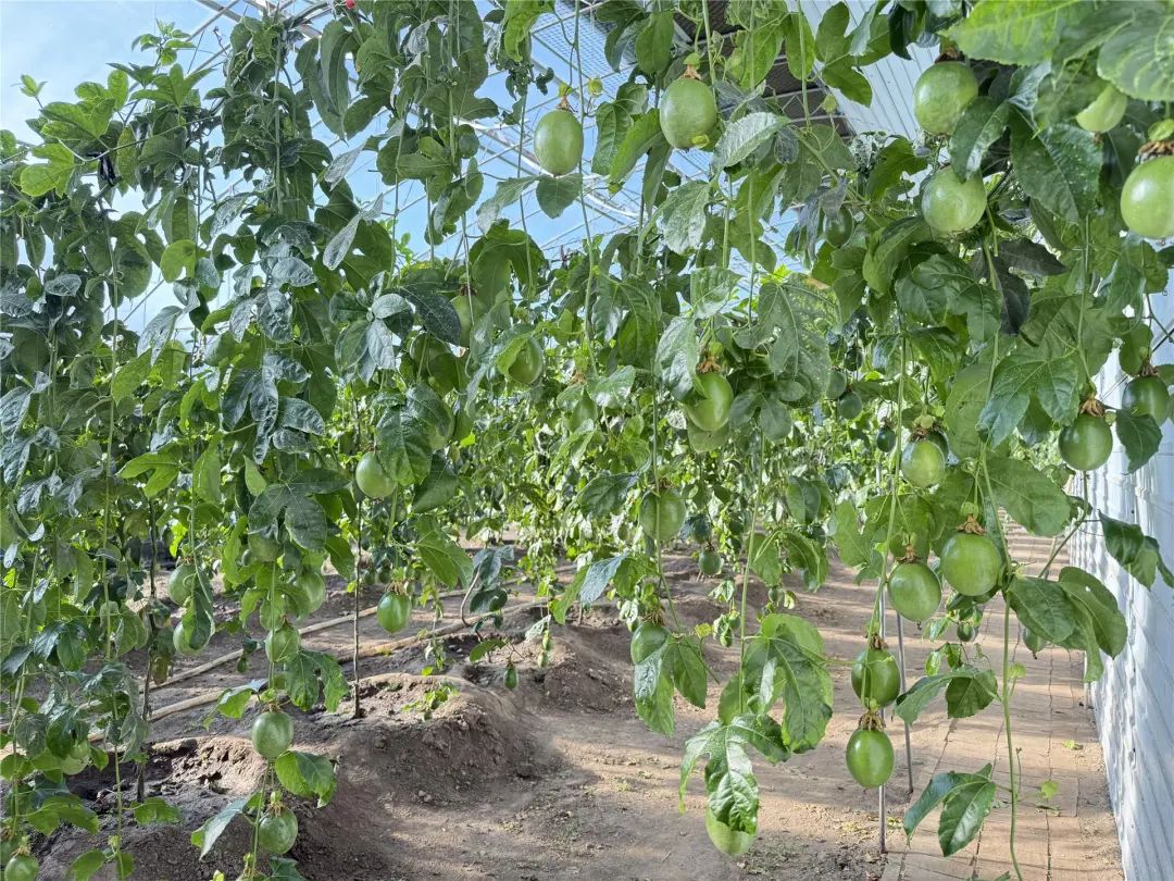 百香果大棚同样是温暖如春,一片生机勃勃的景象。百香果藤蔓缠绕、果实累累,预计再过20天左右,果实将褪去青涩,披上紫红色的外衣,成熟的百香果将为消费者带来新鲜的口感和丰富的营养。