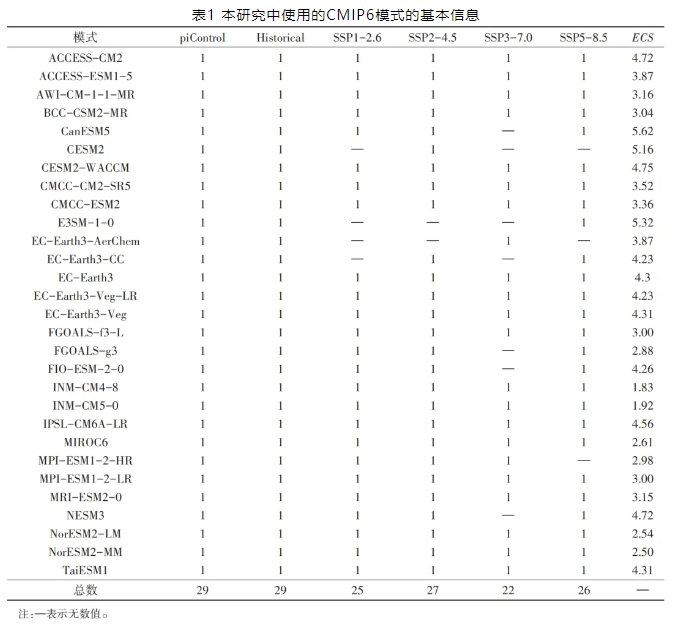 气候敏感性(Equilibrium climate sensitivity,ECS)用于评估气候系统对辐射强迫的响应,现有研究中一般采用全球平均地表气温的变化作为气候响应的指标。ECS是指CO2浓度突变为工业化前2倍的情况下,气候系统重新达到新的平衡态时,全球平均地表气温相比工业化之前的变化。ECS的大小直接影响着当前模式气候模拟和预估的不确定性大小,也对未来预估的气候变化程度大小起决定作用。因此,选取合适ECS范围的模式来对未来气候进行预估可以很大程度上减少不确定性。