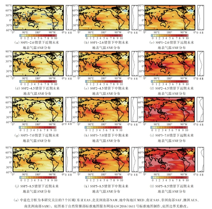 图2 CMIP6模式预估的未来不同排放情景下近期(2021—2040年)、中期(2041—2060年)及远期未来(2081—2100年)年平均地表气温变化信噪比(SNR)多模式平均空间分布和纬向平均值