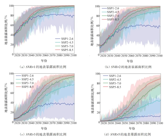 图4 CMIP6模式预估的不同排放情景下超过不同气温变化信噪比阈值的地表面积累计比例