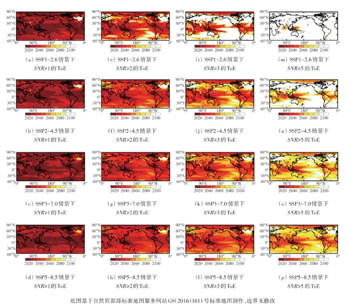 从空间分布来看,热带、北极地区以及中国西南地区和西北地区将更早地面对相同程度的气候变化风险(SNR值),并且随着SNR阈值的增大,超过时间(ToE)也将逐渐变晚。如图3所示。在高排放情景下,与其他区域相比,印度中北部、北大西洋以及欧洲北部地区在21世纪末才达到较高的SNR阈值(~3),这或许与这些地区独特的信号或噪音特征有关。