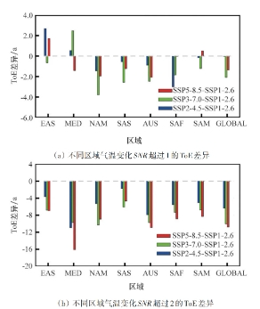 图5 CMIP6模式预估的不同区域在SSP1-2.6情景下与其他高排放情景下气温变化SNR超过不同阈值的ToE差异