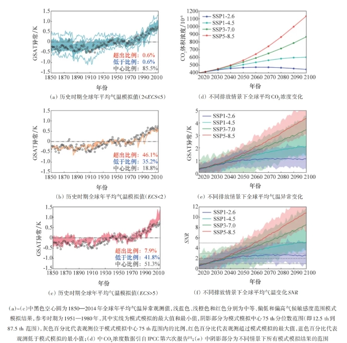 本研究将位于不同ECS范围的模式集合模拟的历史时期全球平均气温(GSAT,本研究中取60°S~75°N范围平均值)相对于1951—1980年异常的时间序列与观测进行对比,以观测超过多模式模拟结果最大值的比例、低于多模式模拟结果最小值的比例和位于多模式模拟中心范围(位于12.5~87.5百分位数区间范围)的比例作为指标,系统评估了位于不同ECS范围的多模式对全球平均气温的模拟表现,然后选取出模拟表现最好的多模式平均结果对未来气候变化风险进行评估。