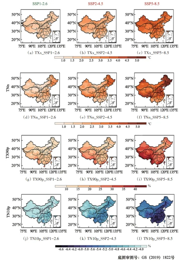 图4 碳中和时期SSP1-2.6情景下以及对应时间SSP2-4.5和SSP5-8.5情景下中国区域TXx(℃)、TNn(℃)、TX90p(%)和TN10p(%)相对历史参考期变化的空间分布