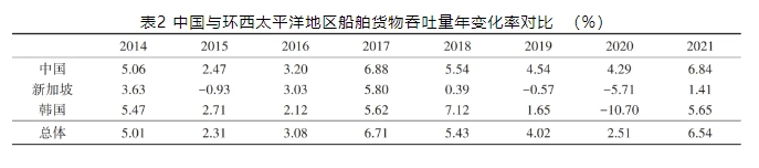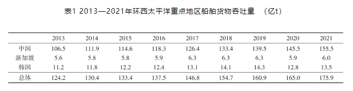 总体来看,2014—2021年环太平洋海域的船运发展整体呈现稳中向好的趋势,货物吞吐量一直处于平稳增加趋势。在2015和2016年,全球经济增速放缓,原油、农产品、铁矿石等大宗商品价格均有所下跌,也对航运业造成了一定影响。在2019—2020年,新冠疫情影响了包括中国、韩国、新加坡在内的环太平洋地区,这几年的货物吞吐量增速有所下降。