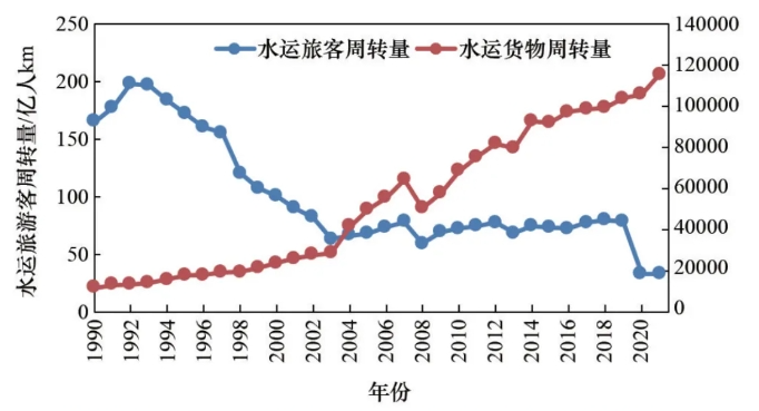 图4 中国水运旅客周转量和水运货物周转量(数据来源:《中国交通年鉴2022》)