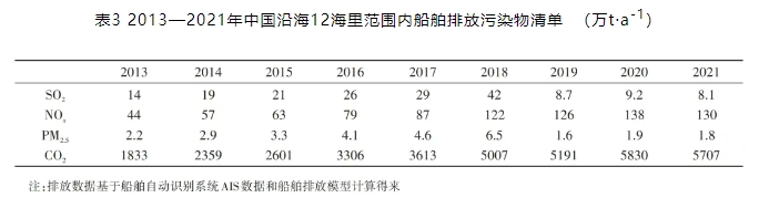 目前航运业SO2的排放已得到较大程度的控制,沿海地区大气SO2浓度已下降到较低水平。然而,船舶的NOx排放和CO2排放随航运量的增长呈现逐年上升趋势。2021年中国沿海12海里范围内的NOx和CO2排放量分别为130万t和5707万t(表3)。因此,未来航运业的持续减排对中国NOx和CO2的排放控制具有重要的意义。