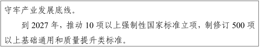 ——标准供给能力大幅提升。发布并实施 200 项以上数字化转型、100 项以上新材料领域以及 100 项以上绿色低碳标准,推动10 项以上强制性国家标准立项。制修订 500 项以上基础通用 和质量提升类标准。