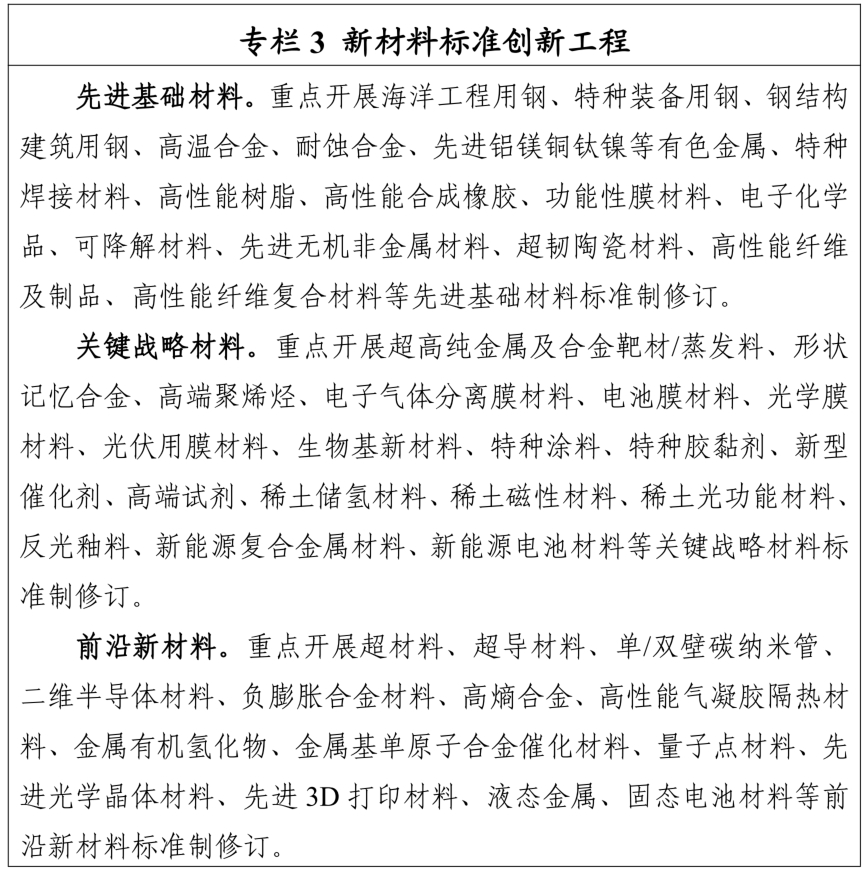 (四)加强新材料产品标准培育。围绕推动重点产业链高质量发展,突出应用场景和产业研发紧密结合,同步推进关键标准研制实施。强化产业链协同创新,鼓励跨行业应用,制定一批通用性强的重点先进基础材料标准。坚持应用牵引,围绕生物医药、船舶及海洋工程、新能源等重点领域,加快推动一批创新成果转化成关键战略材料标准。聚焦前沿材料产业化重点发展指导目录,利用国内超大规模市场条件下制定标准技术响应速度快、标准研制效率高等优势,开展前沿新材料标准研制。