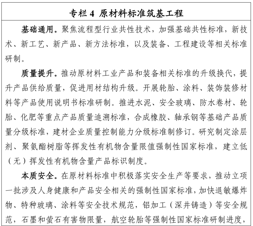 ——标准体系更加优化。完成石化、化工、钢铁、有色金属、建材、稀土、黄金等行业的标准评估及优化,分行业构建支撑原材料工业高质量发展的标准体系。