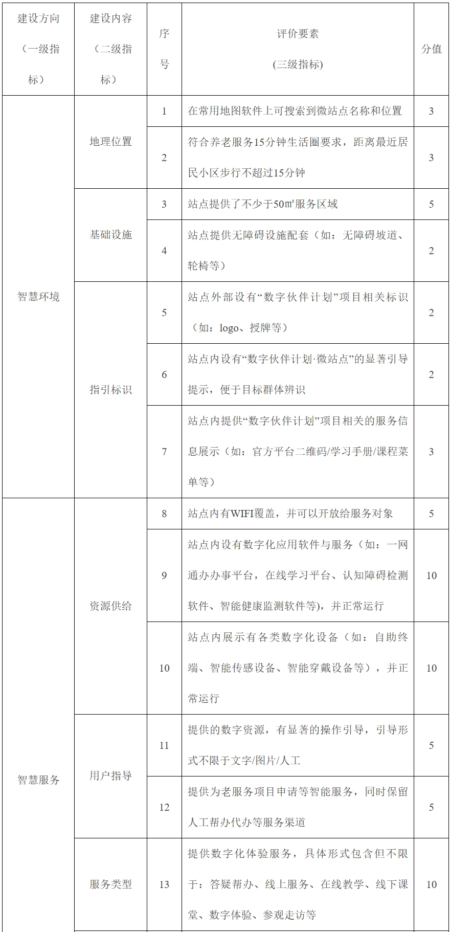 “数字伙伴计划・微站点”共建空间建设要求主要从智慧环境、智慧服务、智慧管理3大建设方向,地理位置、基础设施、指引标识、资源供给、用户指导、服务类型、服务队伍、活跃程度、服务人数、数据回传等10个建设内容,以及18个评价要素三个维度设定“弥合数字鸿沟”工作阵地建设要求和评价体系,助力“弥合数字鸿沟”各项工作量化开展和科学评价。具体建设要求如下: