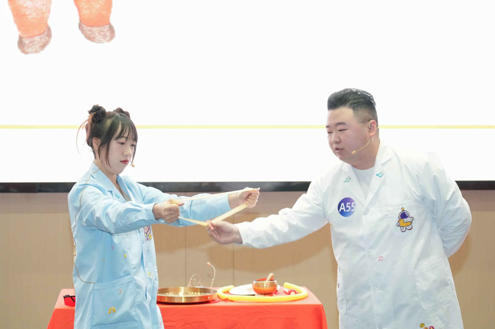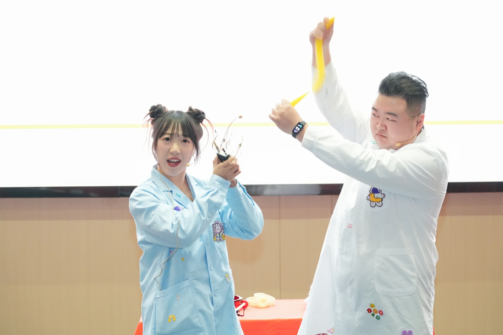 太仓科技馆科学实验项目《先“声”夺人》以科学为核心,艺术为载体,将科学知识融入相声等舞台表演形式,精心设置了一系列科普“包袱”,并在表演过程中巧妙利用激光技术,增加了更多炫目的视觉效果,最终通过完整生动的故事情节、独具新颖的剧情构思,准确、严谨又通俗易懂地呈现了声音的产生、响度以及音调变化的过程,赢得了现场观众的热烈掌声。