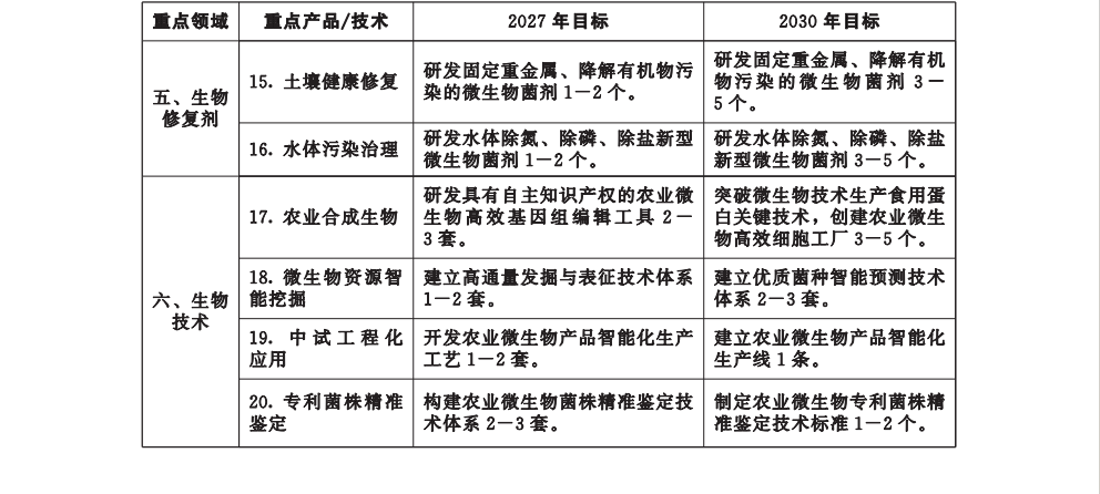 聚焦生物农药、生物兽药、生物饲料、生物肥料、生物修复剂和生物技术等重点领域,重点研发具有自主知识产权和市场竞争力的新产品,攻关具有引领性和颠覆性的新技术。到2027年,取得标志性成果10项以上;到2030年,取得重大标志性成果30项以上,建成国内具有重要影响力的农业微生物技术创新策源地。