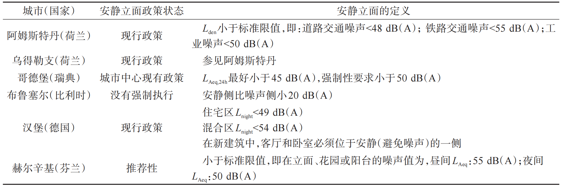 安静的立面最好位于“没有直接交通噪声暴露的城市区域”附近,如(半)封闭庭院。表1给出了欧洲一些城市安静立面的定义,可以看出大部分城市使用绝对值进行定义。对于新建建筑,应考虑创建安静的立面;对于已有的建筑,可以通过以下方式创建安静立面:减少或禁止后街的交通;缩小建筑砌块之间的空隙,从而形成封闭的庭院;采用玻璃屋顶创建庭院空间等。