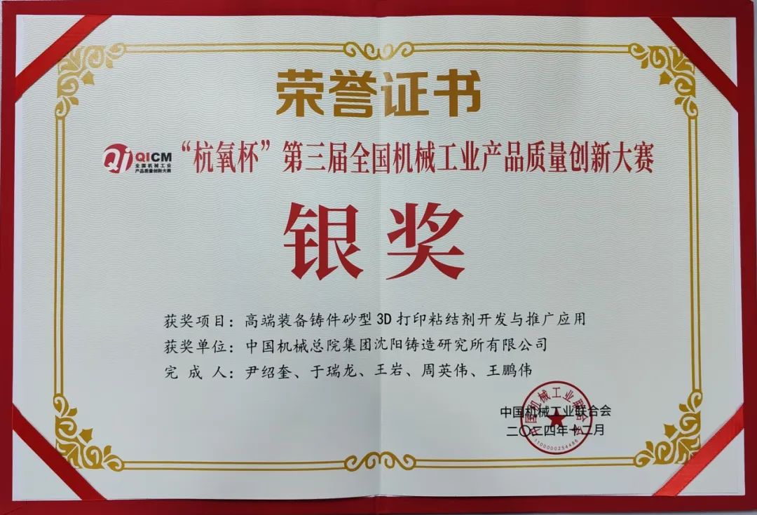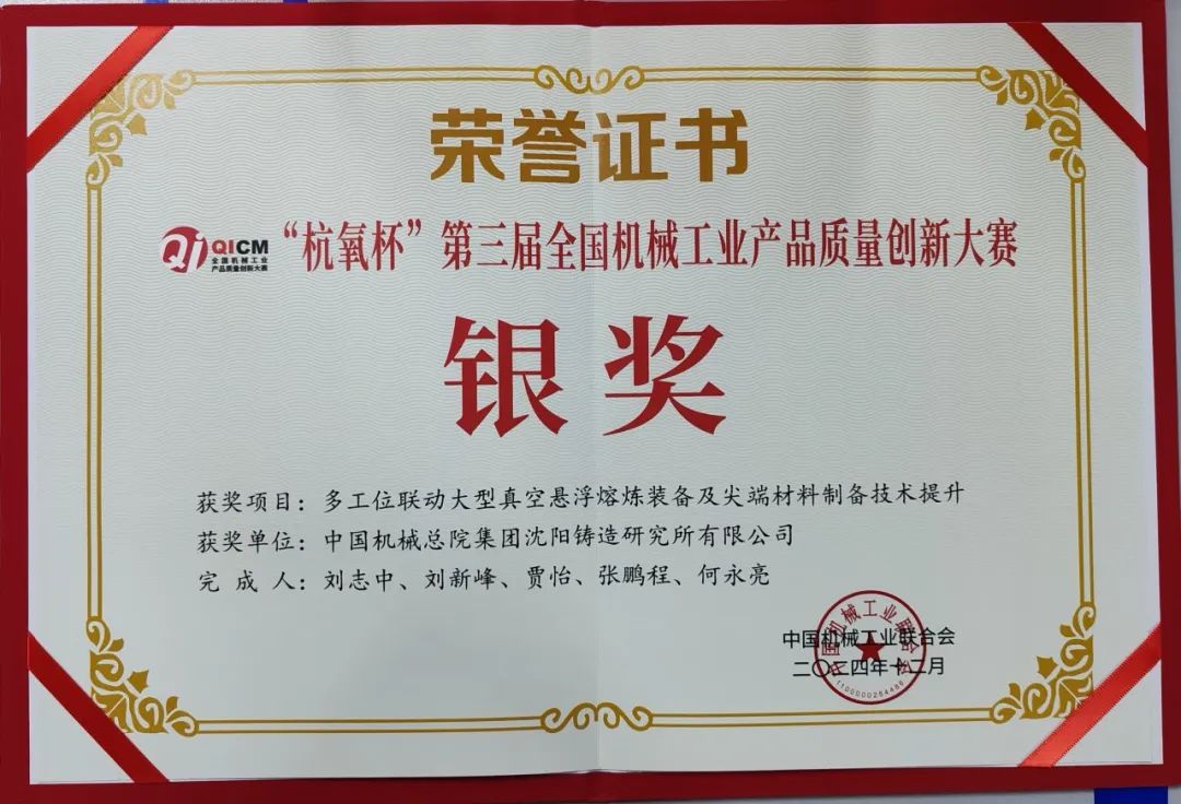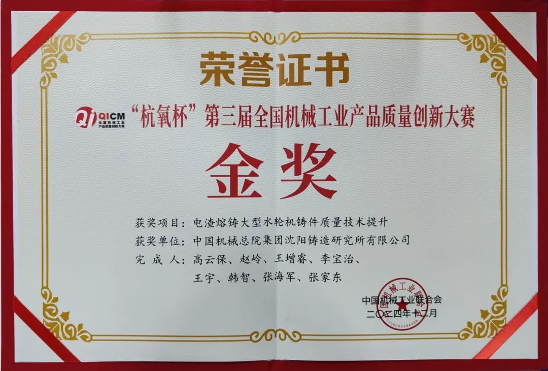 近日,2024年全国机械工业高质量发展大会暨“杭氧杯”第三届全国机械工业产品质量创新大赛颁奖活动在杭州成功举办。沈阳铸造研究所有限公司有4个项目报名参赛,取得一金三银的佳绩。