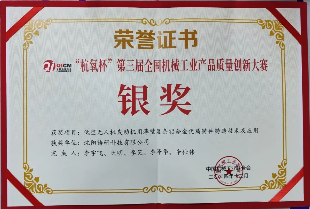 沈铸所铸造设备部“多工位联动大型真空悬浮熔炼装备及剪短材料制备技术提升”项目、铸造材料部“高端装备铸件砂型3D打印粘结剂开发与推广应用”项目、铸研科技“低空无人机发动机用薄壁复杂铝合金优质铸件铸造技术及应用”项目,分别凭借出色的设计理念、卓越的产品质量和持续的创新改进获评大赛银奖。