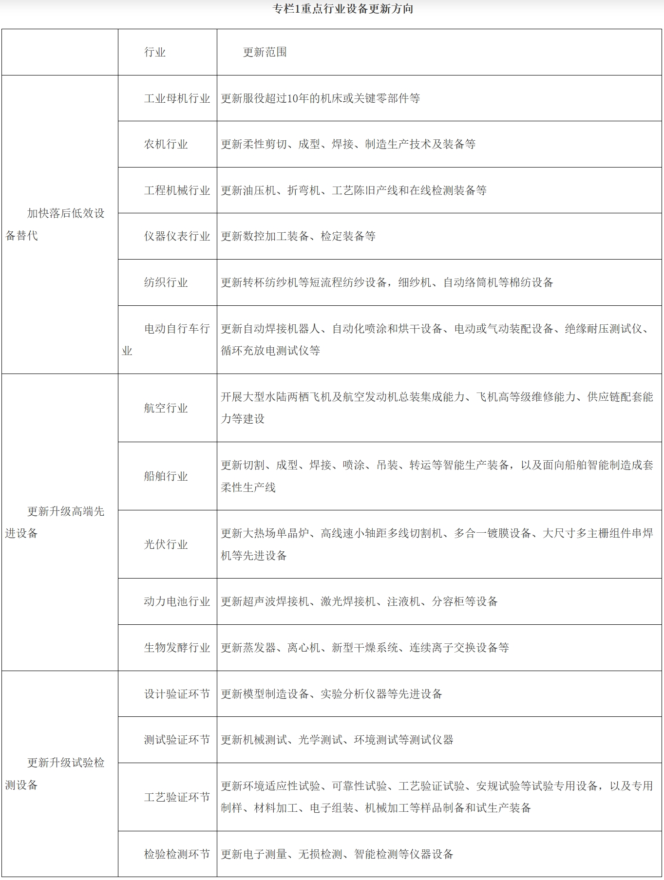2.加快高端先进设备应用。聚焦汽车、航空、船舶、光伏、动力电池、生物医药等生产设备整体处于中高水平的行业,鼓励企业更新一批高技术、高效率、高可靠性的先进设备,以设备升级推动新兴产业提质上量。重点推动汽车行业更新高效率径向铆接机、一体化车身大型压铸机、电动拧紧机、插磁钢机、轻量化镦压成形线、动平衡机、五轴切削机床等核心装备;航空行业开展大型水陆两栖飞机、高等级维修、供应链配套能力等建设;船舶行业更新切割、成型、焊接等智能生产装备,以及智能制造成套柔性生产线;光伏行业更新大热场单晶炉、高线速小轴距多线切割机、多合一镀膜设备、大尺寸多主栅组件串焊机等先进设备;动力电池行业生产设备向高精度、高速度、高可靠性升级,重点更新超声波焊接机、激光焊接机、注液机、分容柜等设备;生物医药行业以临床需求和医工融合为重点进行设备升级,实施萃取提取工艺技改,更新蒸发器、离心机、新型干燥系统、连续离子交换设备等。(责任单位:省经信厅、省发改委、省委军民融合办、省科技厅、省市场监管局,各市州人民政府)